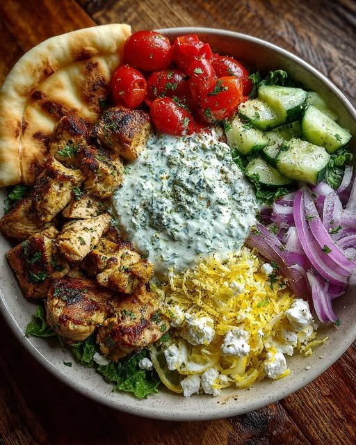 Greek Lemon Chicken Pita Bowls with Minted Feta Sauce bring together bright citrus, savory herbs, creamy feta, and crisp vegetables in one balanced, satisfying meal. It’s fresh without feeling light, hearty without being heavy.