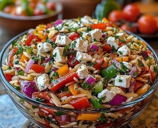 Indulge in the vibrant colors and refreshing flavors of Greece with this classic Orzo Salad. This hearty, one-bowl wonder combines tender orzo pasta, juicy vegetables, tangy feta cheese, and a zesty Greek vinaigrette.