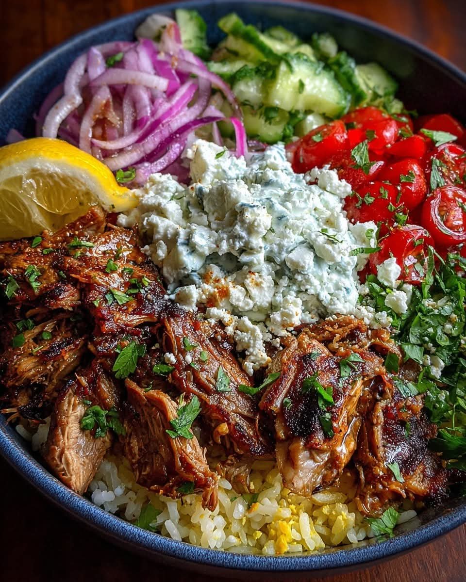 This bowl features tender marinated pork cooked until golden, served over rice or flatbread with crisp veggies and creamy feta sauce infused with lemon, garlic, and chili heat. It’s customizable, high-protein, and ready in under 1 hour.