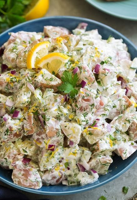 - Put the potatoes and the red onion in the bowl, and then mix them so that they are uniformly coated. Maintain the dish in the refrigerator and serve within a few hours, garnished with more parsley, dill, and lemon zest.