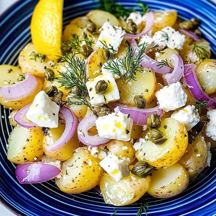 This Greek-style potato salad features tender potatoes tossed with crumbled feta, briny capers, red onion, fresh dill, and a lemony olive oil vinaigrette. It’s refreshing, rustic, and ideal as a side for grilled meats, fish, or part of a mezze spread.