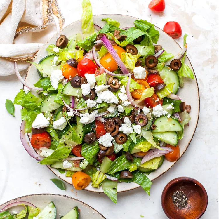 Toss lettuce, cucumbers, tomatoes and red onion with the dressing. Scatter olives and feta cheese over the top and serve.