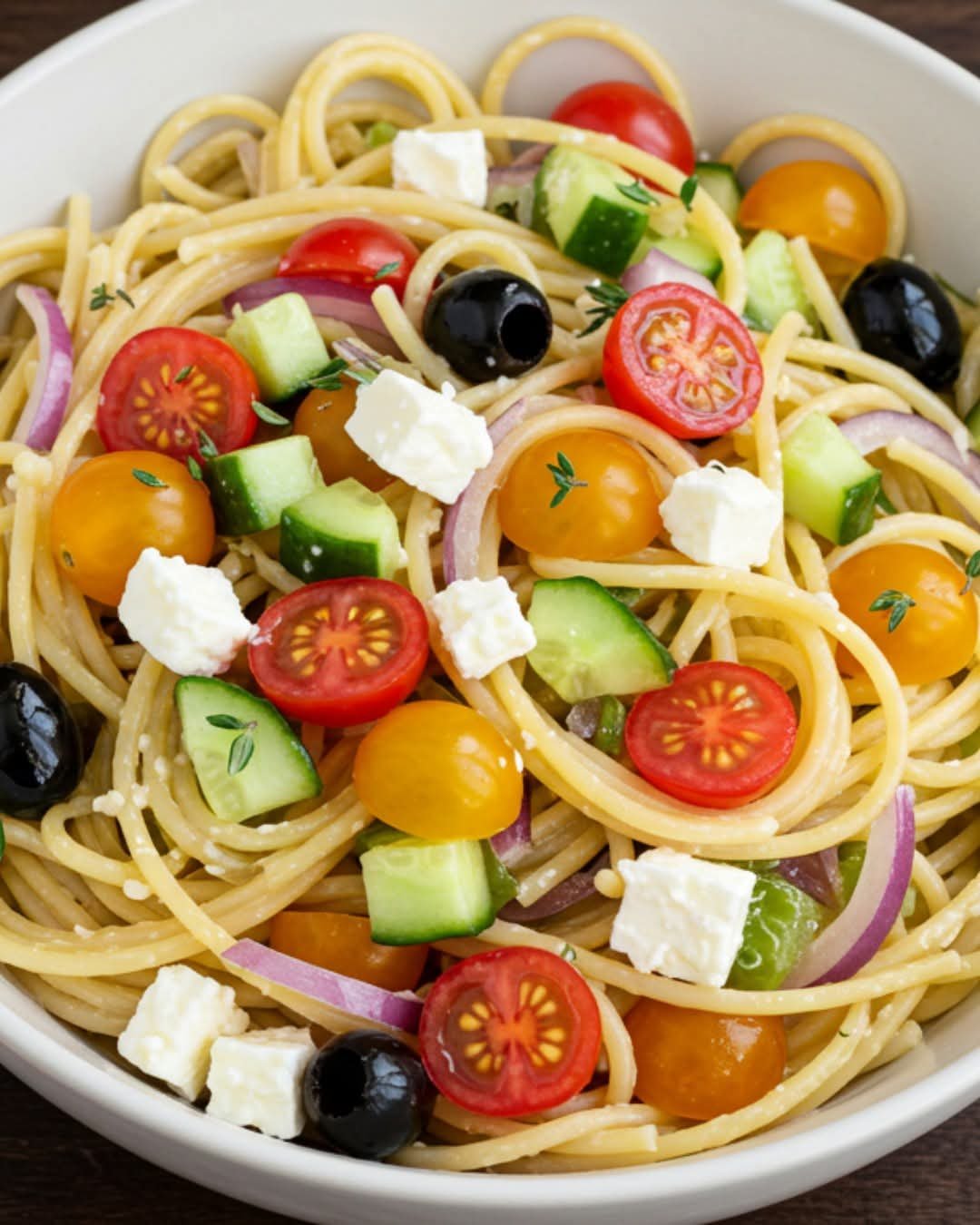 This Greek Spaghetti Salad is a fresh, vibrant, and Mediterranean-inspired dish that combines classic Greek salad ingredients with pasta for a satisfying and refreshing meal. Tossed in a zesty homemade dressing, this salad is packed with juicy tomatoes, crisp cucumbers, tangy feta cheese, and briny olives. It’s perfect for meal prep, picnics, or a light yet filling dinner.