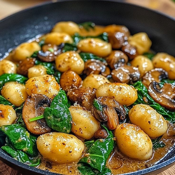 This warm and hearty dish features pillowy gnocchi sautéed until golden, then tossed with garlicky mushrooms, baby spinach, tangy feta cheese, and fresh herbs — all in a light lemon-olive oil glaze. A comforting vegetarian main ready in 30 minutes, all in one skillet!