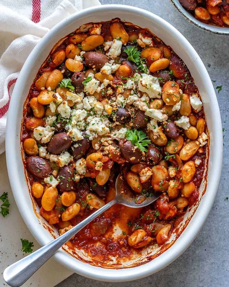 These Greek-style baked beans with olives are slow-baked in a rich tomato-olive oil sauce with onion, garlic, and herbs. Comforting, hearty, and naturally plant-based, this dish is classic Mediterranean comfort food—perfect as a main with bread or a flavorful side to fish or roast chicken. Mild, fragrant, and deeply satisfying.