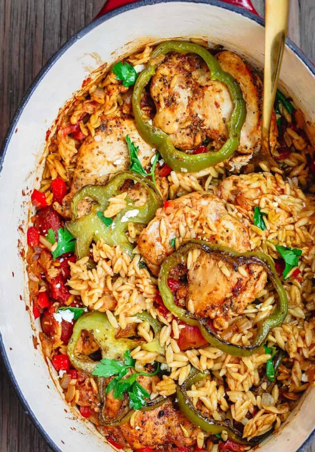 Nestle the chicken pieces into the orzo mixture, and top with the bell pepper slices.