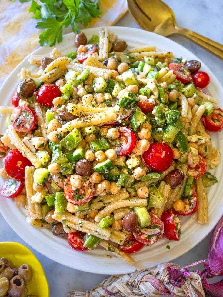 Greek style pasta salad with chickpeas cucumber tamatoes