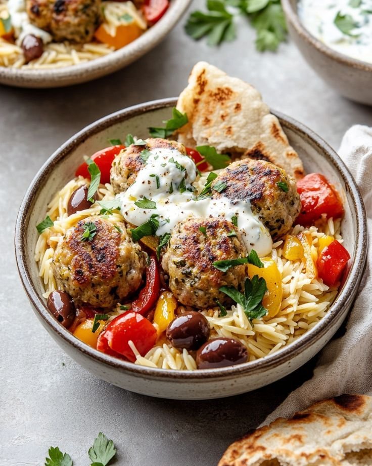 Juicy herb-loaded turkey meatballs baked until golden, served over fluffy lemony orzo, and topped with a dreamy whipped feta yogurt sauce. It’s refreshing, protein-packed, and perfect for lunch, dinner, or meal prep.