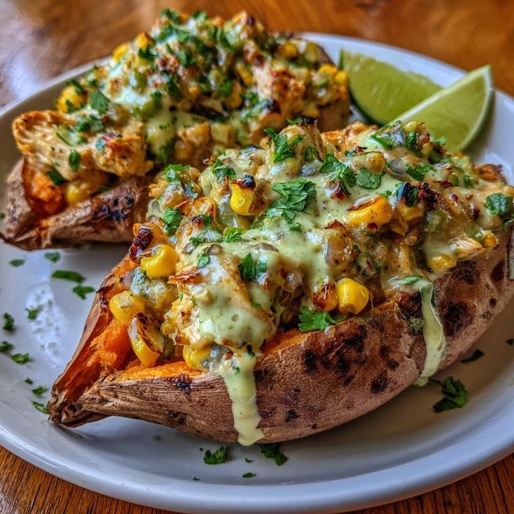 Green Chile Chicken Sweet Potatoes with Lime Cottage Drizzle is a vibrant, protein-packed meal featuring roasted Sweet Potato halves topped with savory shredded Chicken mixed with mild Green Chile and finished with a creamy, tangy Cottage Cheese and lime drizzle.The combination of sweet, spicy, and creamy flavors makes this dish perfect for healthy weeknight dinners or meal prep bowls.