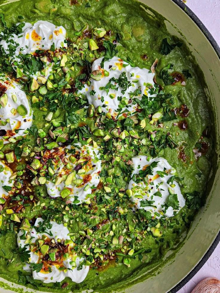 Creamy white beans tossed in a bright green goddess–style pistachio pesto with herbs, lemon, and olive oil.