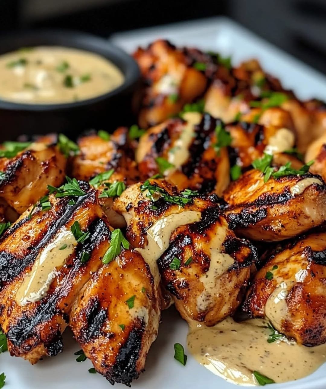 Arrange the grilled chicken bites on a serving platter. Drizzle with the creamy mustard sauce or serve it on the side as a dip.