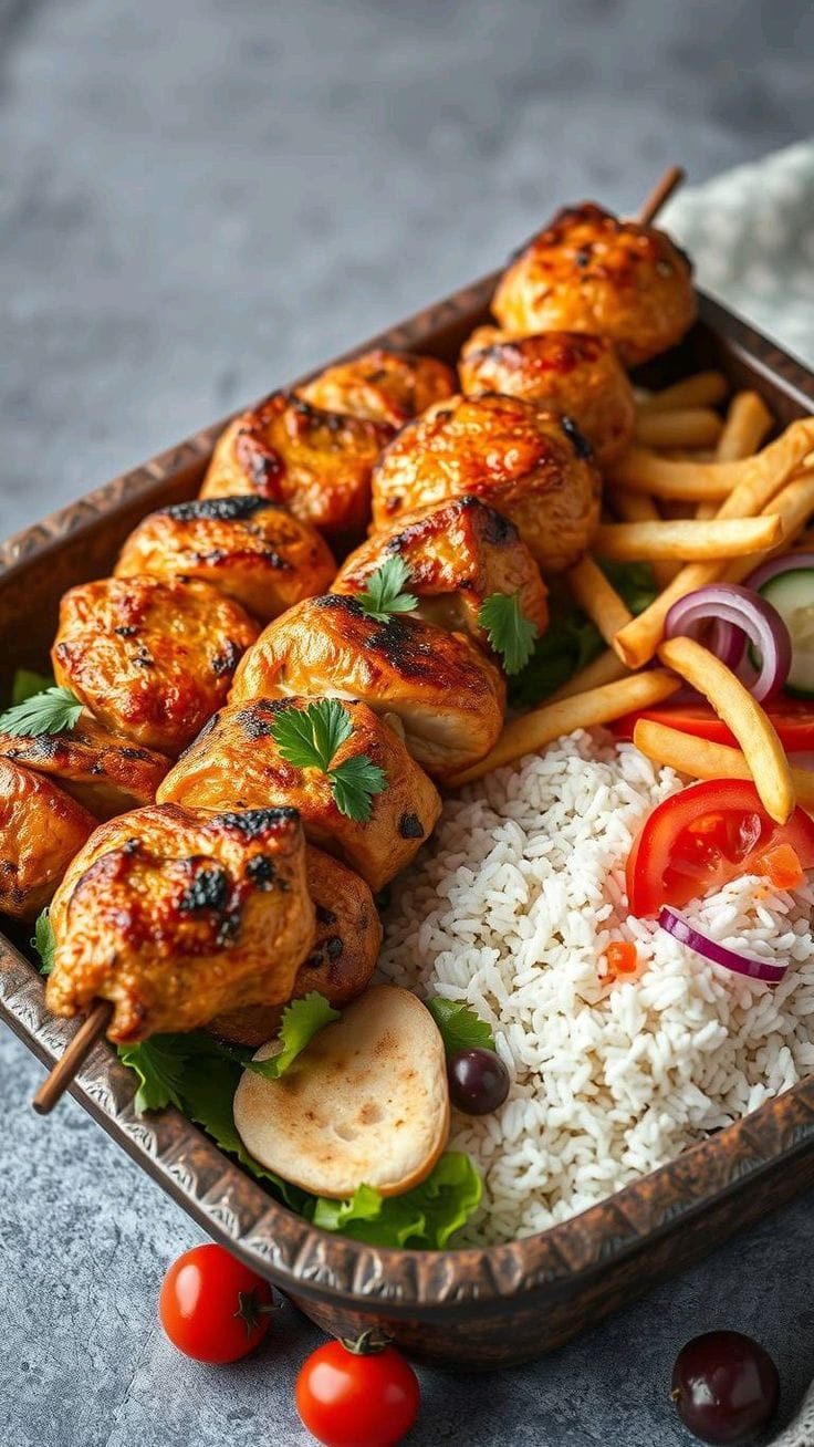 This platter is a Mediterranean feast of juicy marinated chicken skewers, grilled vegetables, fresh salad, warm pita, and creamy dips like hummus and tzatziki. It’s colorful, balanced, and perfect for family-style dining or entertaining guests.