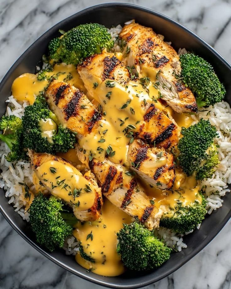 Juicy grilled chicken served over fluffy rice, paired with perfectly steamed broccoli, all topped with a silky, restaurant-style cheddar cheese sauce. A comfort-meets-healthy bowl you’ll want again and again.