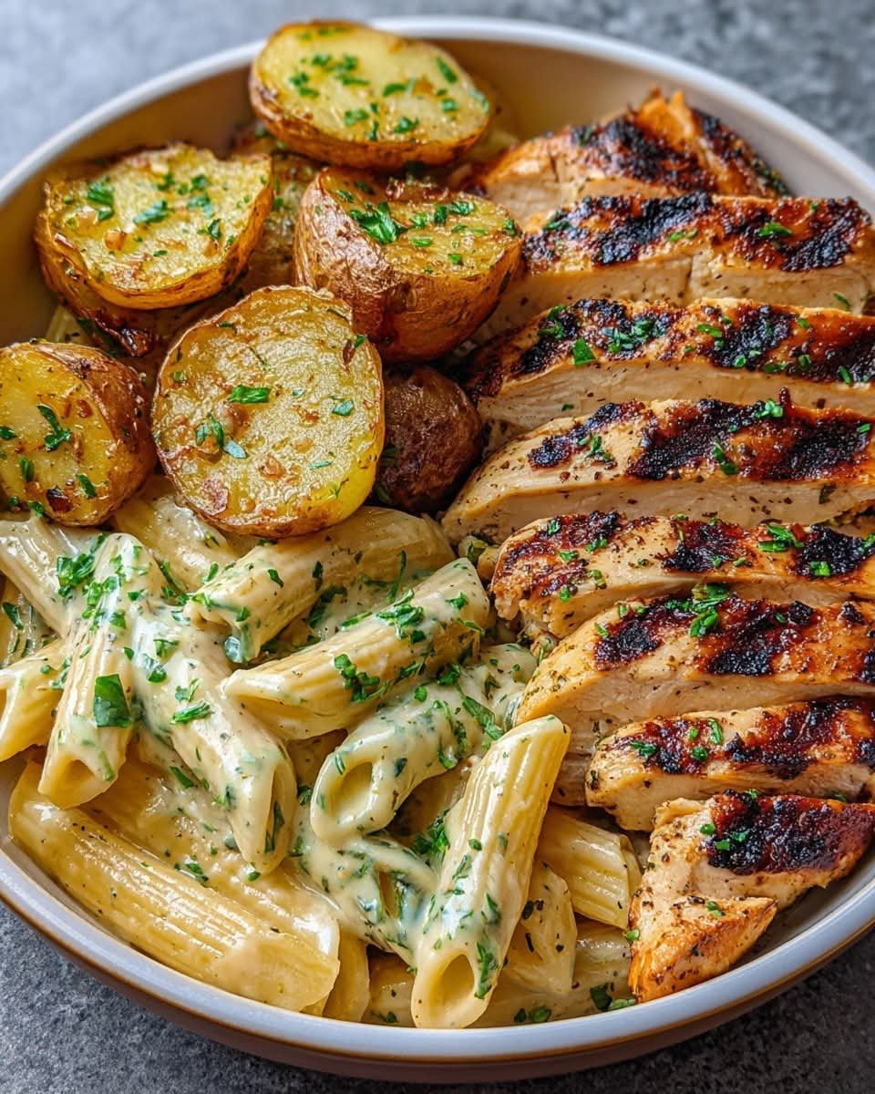 This dish combines tender, smoky grilled chicken with rich and velvety creamy penne pasta and perfectly crisp golden roasted potatoes. The balance of textures—charred chicken, silky pasta, and crunchy potatoes—makes it a satisfying and comforting meal perfect for weeknights or entertaining.
