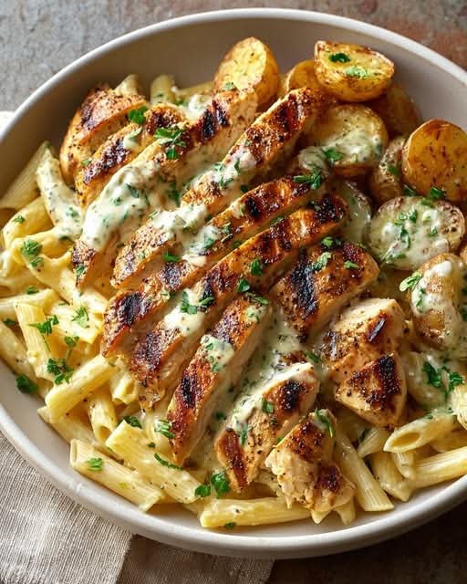 Grilled Chicken with Creamy Penne Pasta & Roasted Potatoes