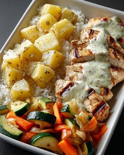 Assemble: Layer rice at the bottom of a plate or bowl. Add roasted potatoes, sautéed vegetables, and sliced grilled chicken on top. Spoon herb sauce over the chicken.