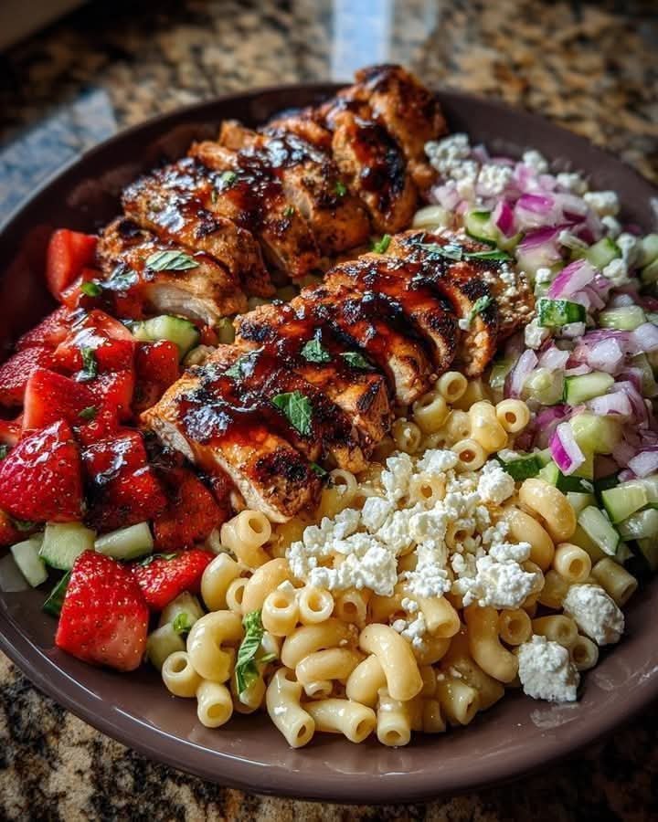 This vibrant and flavorful dish brings together sweet and savory elements in perfect harmony. Grilled Chicken with Strawberry Balsamic Glaze offers juicy, smoky chicken glazed in a tangy-sweet reduction, while the Feta Ditalini Pasta Salad balances the richness with a light, refreshing Mediterranean-style bite. The combination is not only stunning on the plate but also crowd-pleasing and ideal for warm weather dinners, potlucks, or outdoor gatherings.