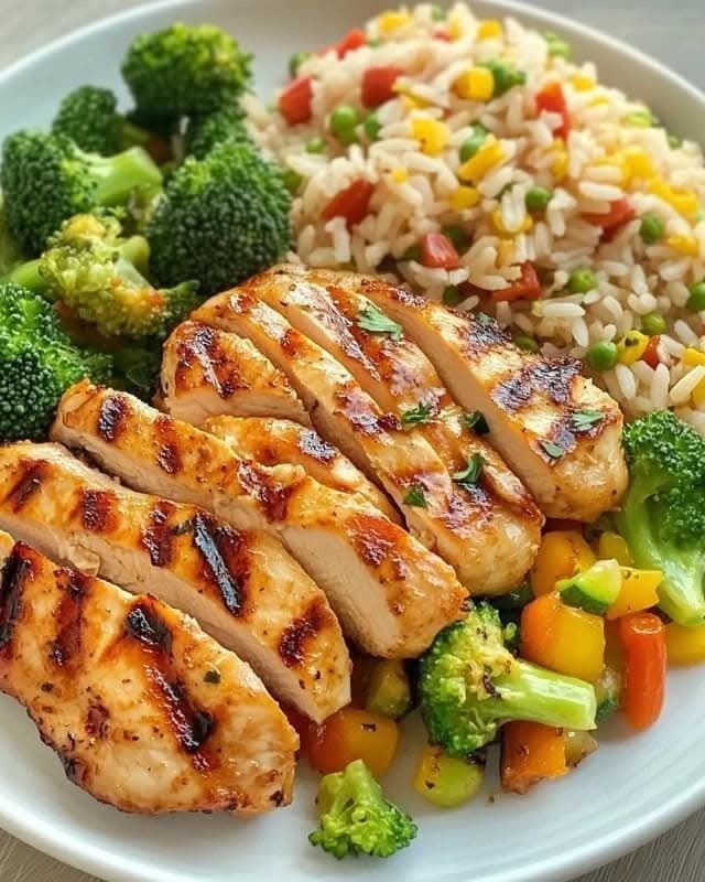 This Grilled Chicken with Veggies, Rice & Steamed Broccoli is a classic balanced meal—perfect for clean eating, fitness goals, or meal prep. Juicy Chicken is paired with fluffy Rice, colorful sautéed vegetables, and nutrient-rich Broccoli.It’s simple, satisfying, and packed with lean protein, fiber, and essential nutrients.