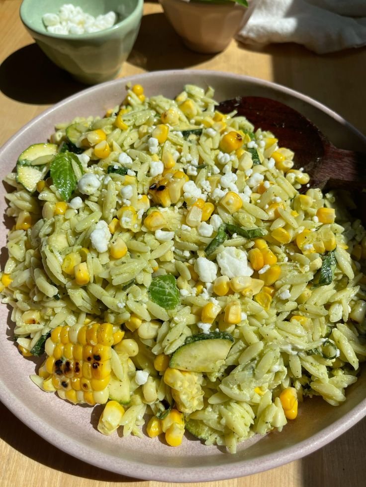 This bright, fresh, Mediterranean-style salad combines grilled sweet corn, charred zucchini, and tender orzo pasta, all tossed in a zesty lemon–herb dressing with feta and fresh basil.