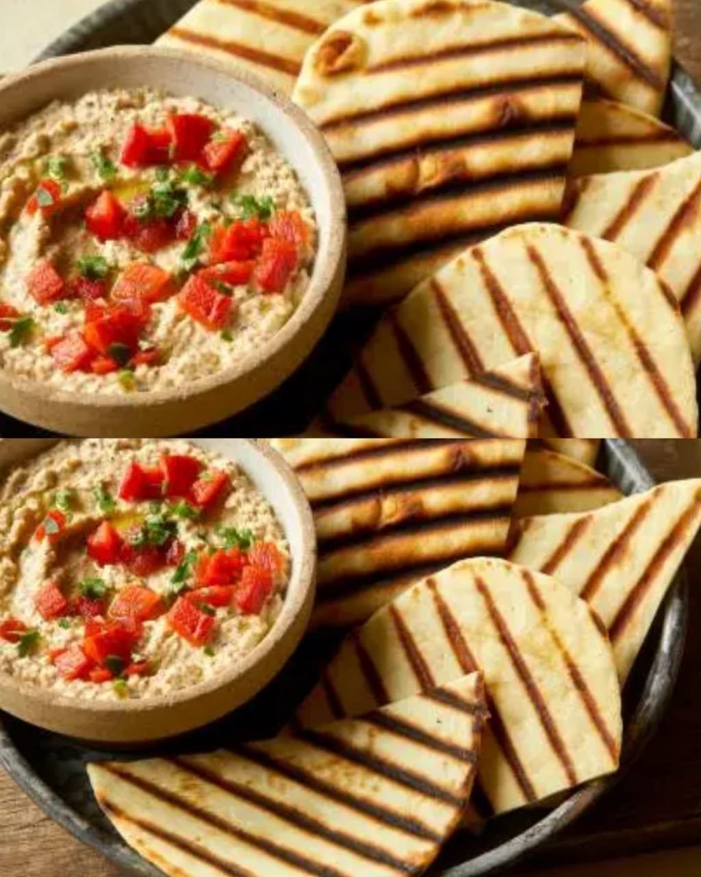 - To finish off the dip, drizzle the remaining two tablespoons of olive oil over it. A garnish of chopped parsley and diced peppers should be placed on top. Lavash or pita bread should be served warm.