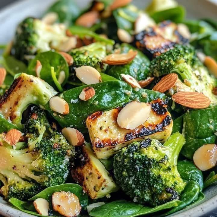 This vibrant and flavorful salad combines crispy, grilled halloumi with roasted broccoli, fresh spinach, and crunchy almonds. It’s a perfect mix of textures and flavors—savory, nutty, and slightly tangy from the lemon dressing. Ideal for a light lunch or a hearty side dish, this salad is both satisfying and nutritious!