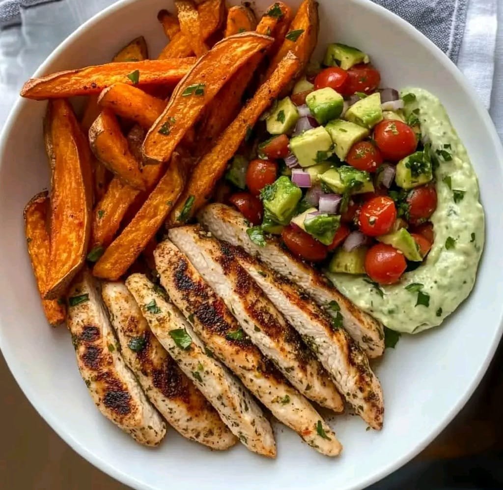 Grilled Herb Chicken Bowl with Sweet Potato Fries and Avocado Salsa is a flavorful and nutrient-packed meal that brings together vibrant colors and wholesome ingredients. Juicy, herb-marinated grilled chicken is paired with crispy, oven-baked sweet potato fries, creating a perfect balance of savory and subtly sweet flavors. The dish is topped with a refreshing avocado salsa, made with creamy avocado, zesty lime, fresh cilantro, and diced tomatoes, adding a burst of freshness. This satisfying bowl is rich in lean protein, healthy fats, and complex carbs, making it a well-rounded choice for lunch or dinner. Easy to customize and brimming with bold flavors, this dish is as nourishing as it is delicious.