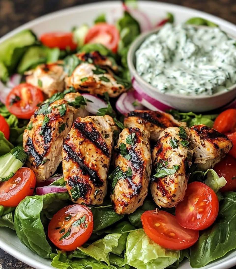 Grilled Mediterranean Chicken Salad with Homemade Tzatziki Sauce