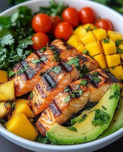- Top with grilled salmon, mango, avocado, cherry tomatoes, and a sprinkle of chopped cilantro.