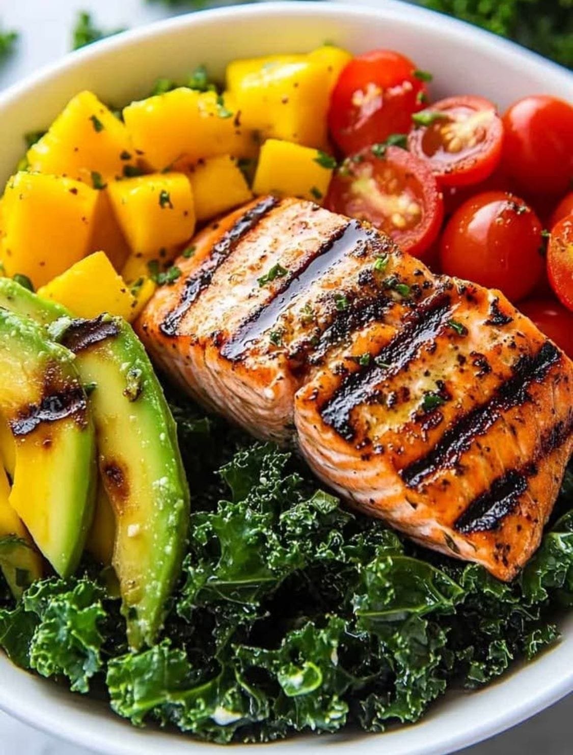Grilled Salmon Kale Bowl with Mango, Avocado, and Cherry Tomatoes
