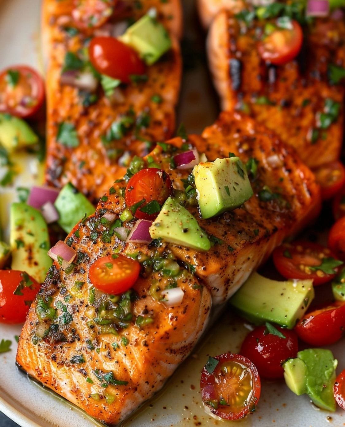 This Grilled Salmon with Avocado Tomato Salsa is a fresh vibrant meal perfect for spring and summer. Juicy grilled salmon fillets are seasoned simply to let their natural flavors shine then topped with a zesty salsa made from creamy avocado sweet cherry tomatoes red onion and fresh herbs. It is a colorful light and satisfying dish that works beautifully for Easter gatherings backyard dinners or any time you crave something healthy and flavorful.