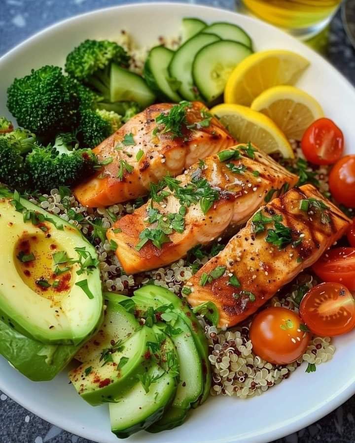 The juicy sweetness of cherry tomatoes, the crisp green freshness of steamed broccoli, the creamy velvety richness of avocado, the invigorating crunch of cucumber, and the soft, oceanic deliciousness of grilled salmon all come together to create a nutritious and nutty dish. This nutritious, filling, tasty, and healthful salad is ideal for a light lunch or supper!