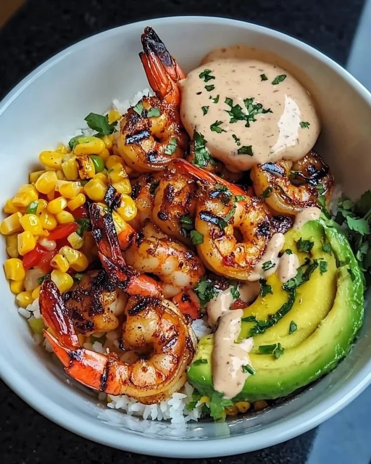 This bowl combines smoky grilled shrimp, sweet corn salsa, creamy avocado, and a zesty yogurt-lime sauce — all layered over fluffy rice or quinoa. It’s light yet filling, colorful, and perfect for a quick, healthy weeknight meal that feels restaurant-worthy.