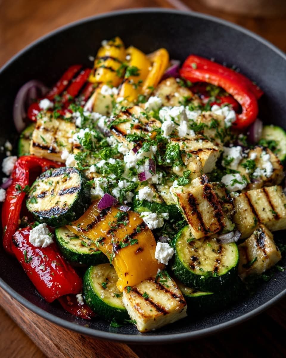 This colorful Mediterranean salad combines smoky grilled zucchini and sweet bell peppers with tangy feta and a bright lemon dressing. It’s a refreshing summer dish that works beautifully as a side for grilled meats, seafood, or as a vegetarian main.