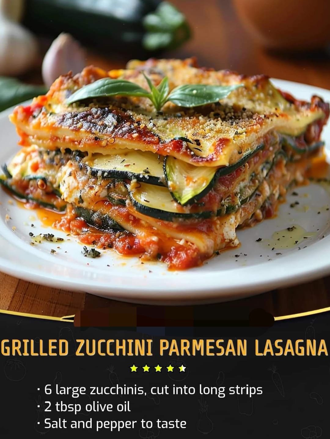 Assemble the lasagna: Preheat the oven to 375°F (190°C). In a baking dish, start with a thin layer of marinara sauce, followed by a layer of grilled zucchini slices. Spread a layer of the ricotta mixture over the zucchini, then sprinkle with shredded mozzarella and grated Parmesan. Repeat the layers until all ingredients are used, finishing with mozzarella and Parmesan on top.