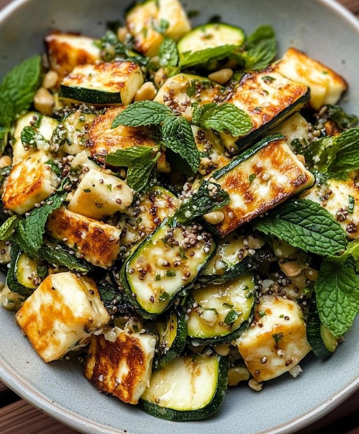 This Grilled Zucchini Salad with Halloumi, Tahini & Mint is a light yet satisfying Mediterranean dish that balances smoky grilled vegetables, salty golden halloumi, and a creamy lemon-tahini dressing. Fresh mint adds brightness, making it perfect as a summer salad, healthy lunch, or elegant side dish. It’s vegetarian, protein-rich, and naturally gluten-free.