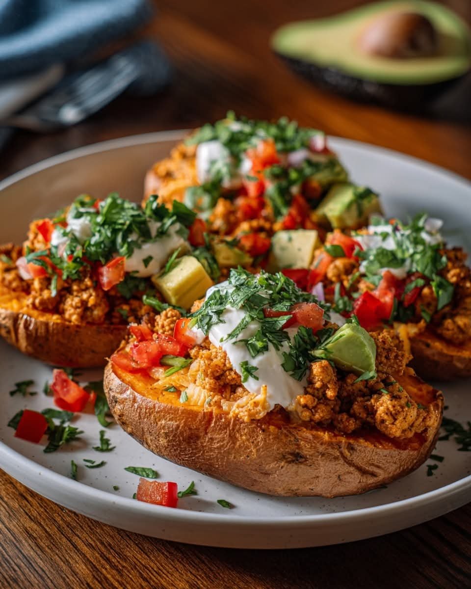 Roasted sweet potatoes are stuffed with savory ground turkey, vegetables, and Mediterranean spices, then topped with fresh herbs and a creamy drizzle. This dish makes a balanced meal with protein, fiber, and healthy carbs.
