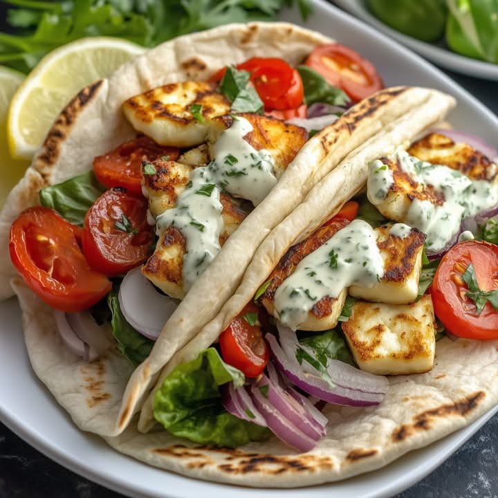 Halloumi and roasted veggie pita wraps are a vibrant, delicious, and satisfying meal. Grilled, squeaky halloumi cheese pairs beautifully with sweet roasted vegetables like bell peppers, zucchini, and red onions. Wrapped inside a soft, warm pita and finished with a dollop of creamy yogurt or tahini sauce, this dish is both hearty and refreshing. Perfect for a quick lunch, casual dinner, or meal prep!