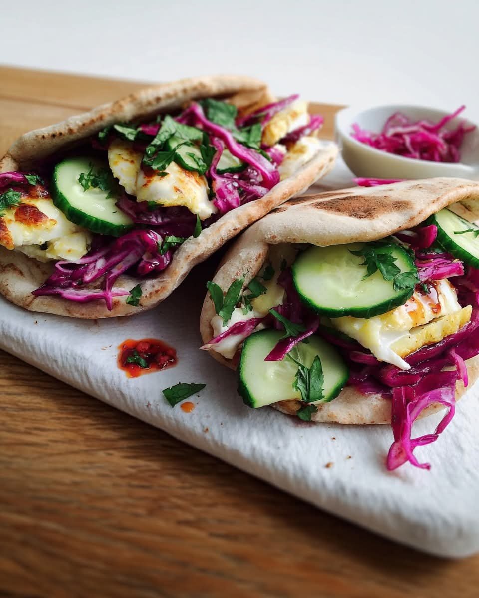 This Mediterranean-inspired dish is a vibrant, satisfying vegetarian meal. Crispy, golden halloumi is tucked into warm wholemeal pitta pockets with crunchy cucumber and zingy pickled red cabbage. It’s quick to make, incredibly flavorful, and perfect for lunch, dinner, or entertaining.