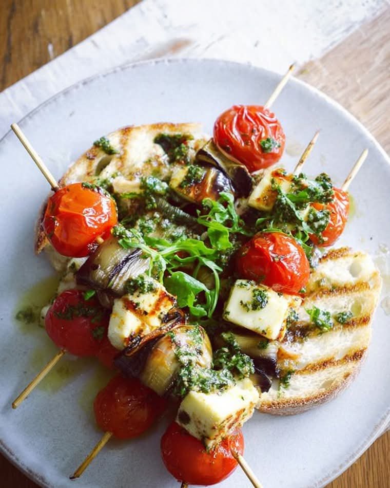 Thread the ingredients onto skewers in alternating order: tomato → halloumi → aubergine. Repeat