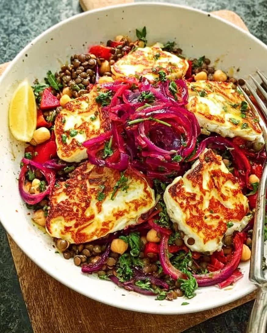 A zesty Mediterranean-inspired dish featuring crispy halloumi over garlicky lemon lentils, with fresh herbs and olive oil.