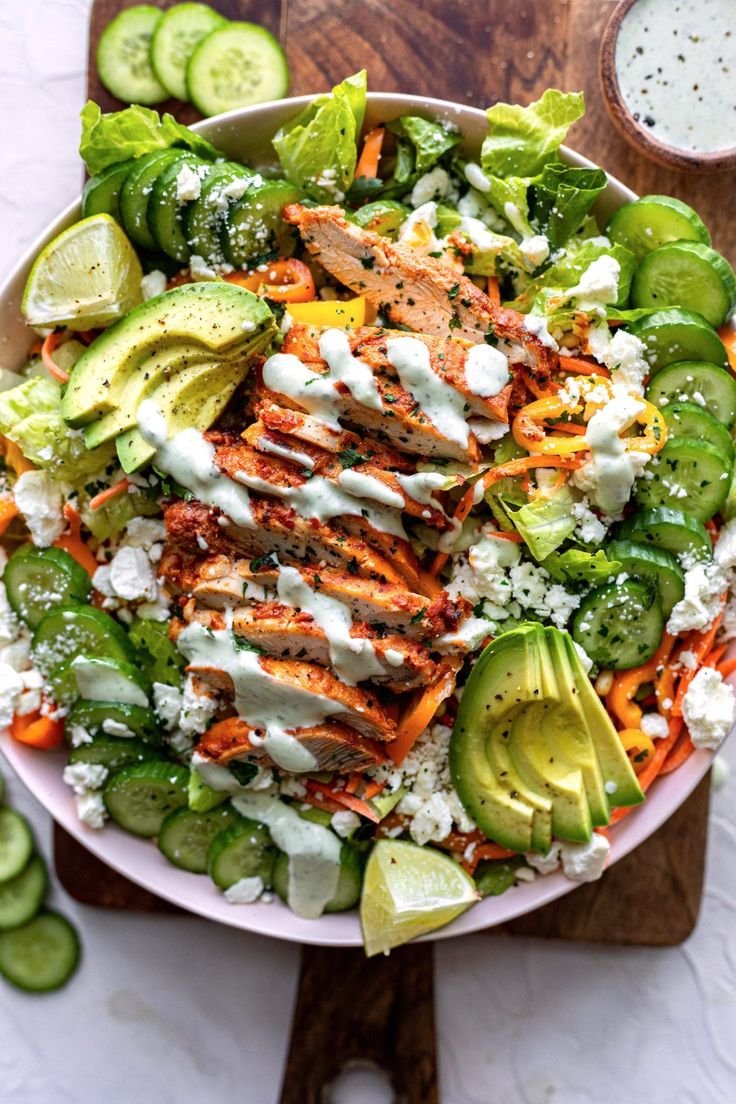 This refreshing salad brings together smoky harissa grilled chicken with creamy avocado, crisp cucumbers, crunchy carrots, and fresh lettuce. Tossed in a light lemon-herb dressing, it’s a perfect balance of spicy, cool, and satisfying — ideal for a healthy lunch or dinner.