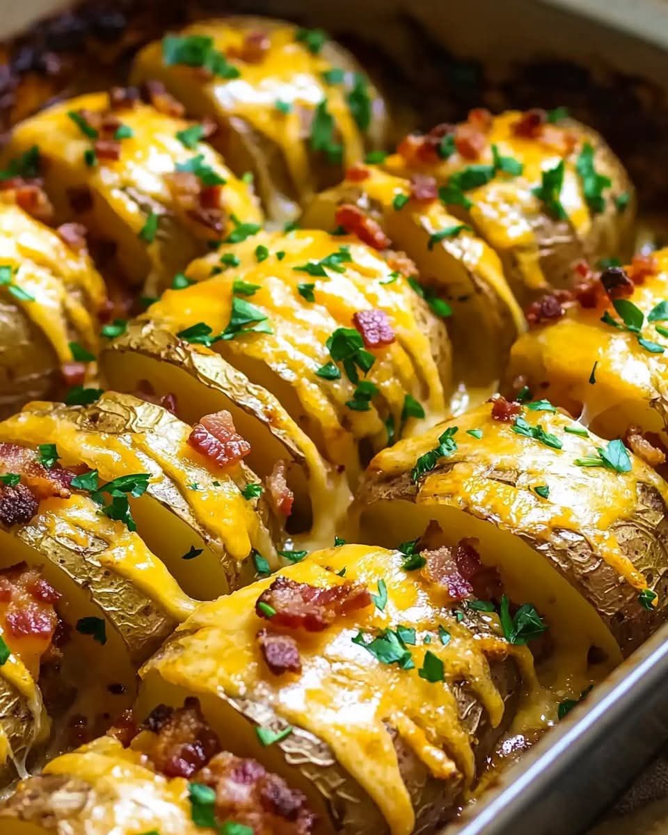 This Hassel back Bacon Potato Bake is a rich and comforting dish, perfect as a hearty side or even a main course. Thinly sliced potatoes are infused with butter, garlic, and cheese, while crispy bacon adds the perfect savory crunch. This dish is a showstopper at gatherings and pairs wonderfully with roasted meats or a fresh salad.