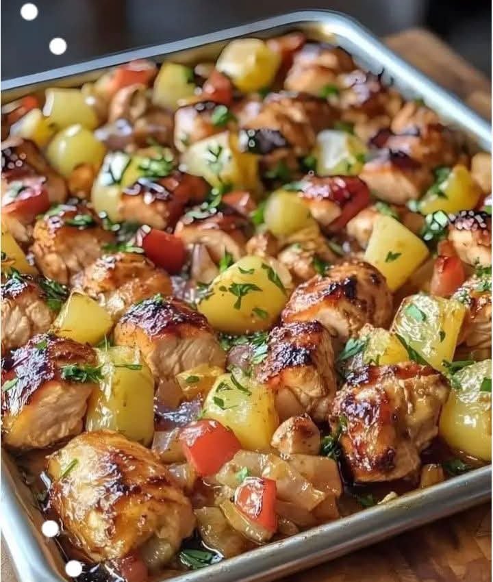 This vibrant and tropical-inspired sheet pan dish features juicy chicken pieces marinated in a sweet and tangy Hawaiian glaze, roasted with bell peppers, red onions, and pineapple chunks. It’s a one-pan wonder—perfect for weeknights, meal prep, or when you’re craving something colorful, healthy, and packed with flavor.