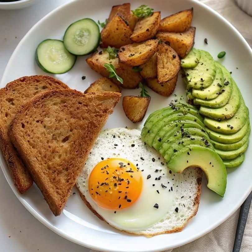 Assemble the plate: oast, egg, potatoes, avocado, and cucumbers.