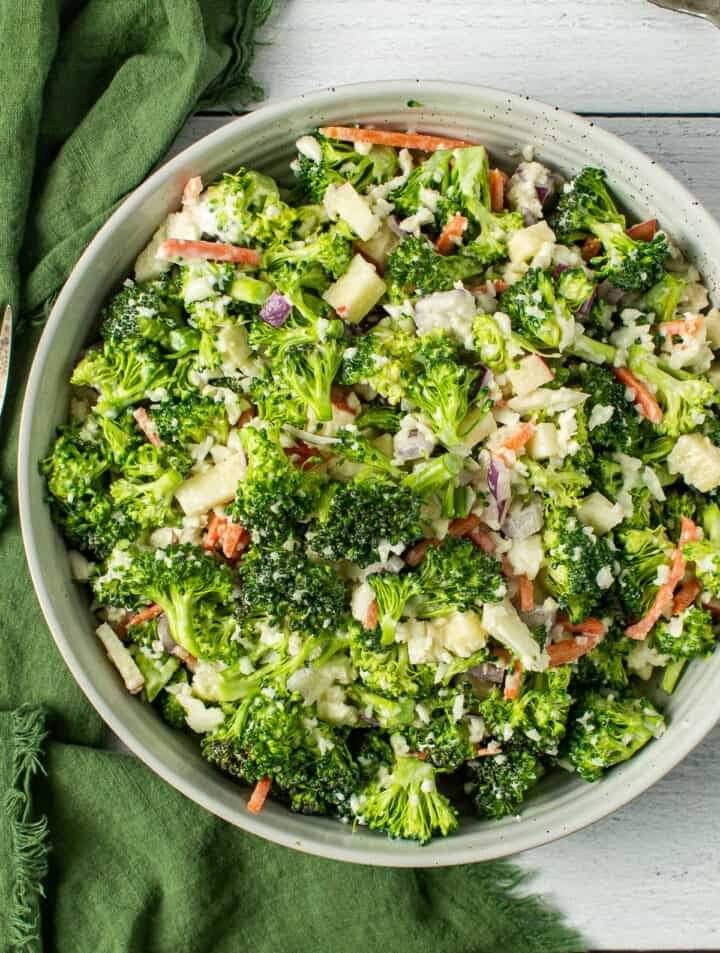 Healthy broccoli cauliflower salad that’s creamy and crunchy! Filled with red onion, apples, and carrots, and covered in a tangy-sweet cashew mayo dressing. Vegan, gluten-free, and oil-free!