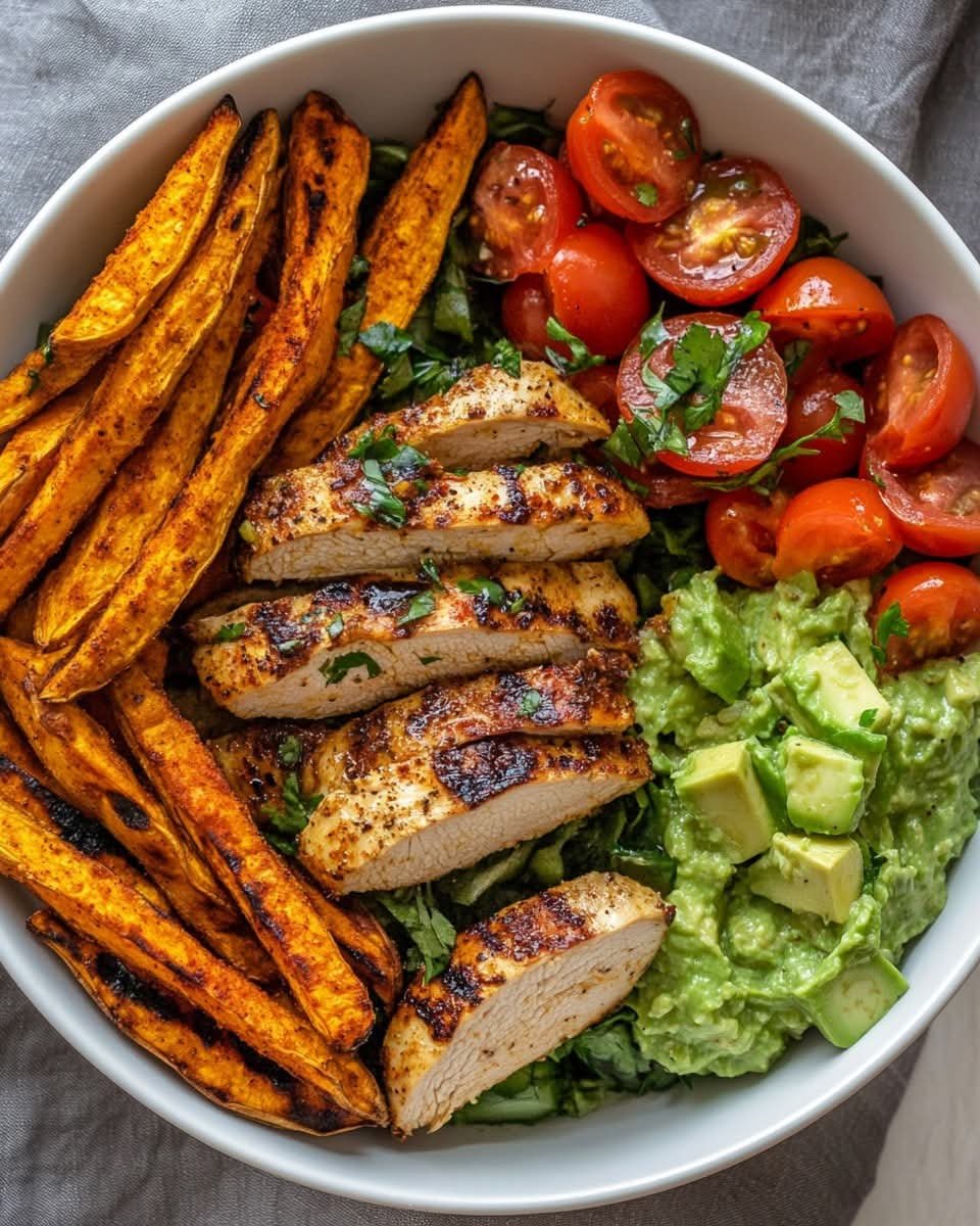 Healthy Chicken Power Bowl with Sweet Potato Fries & Tomato Avocado Mix