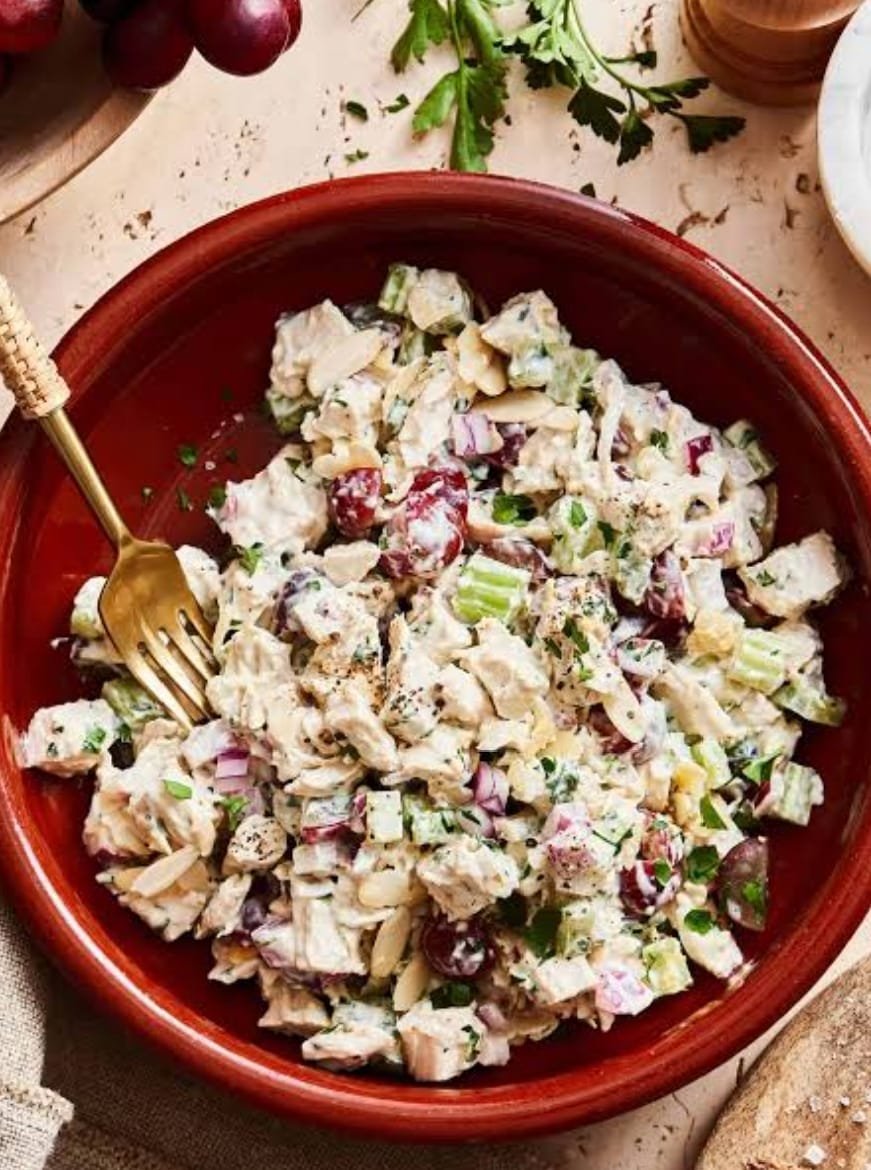 3. Combine: Add chicken, celery, apple/grapes, onion, herbs, and nuts. Mix until evenly coated.