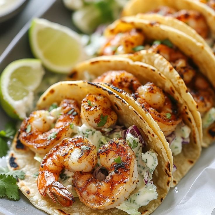 Juicy cilantro-lime marinated shrimp tucked into soft tortillas and topped with a crunchy, creamy, yogurt-based slaw. Fresh, bright, healthy, and ready in under 25 minutes.