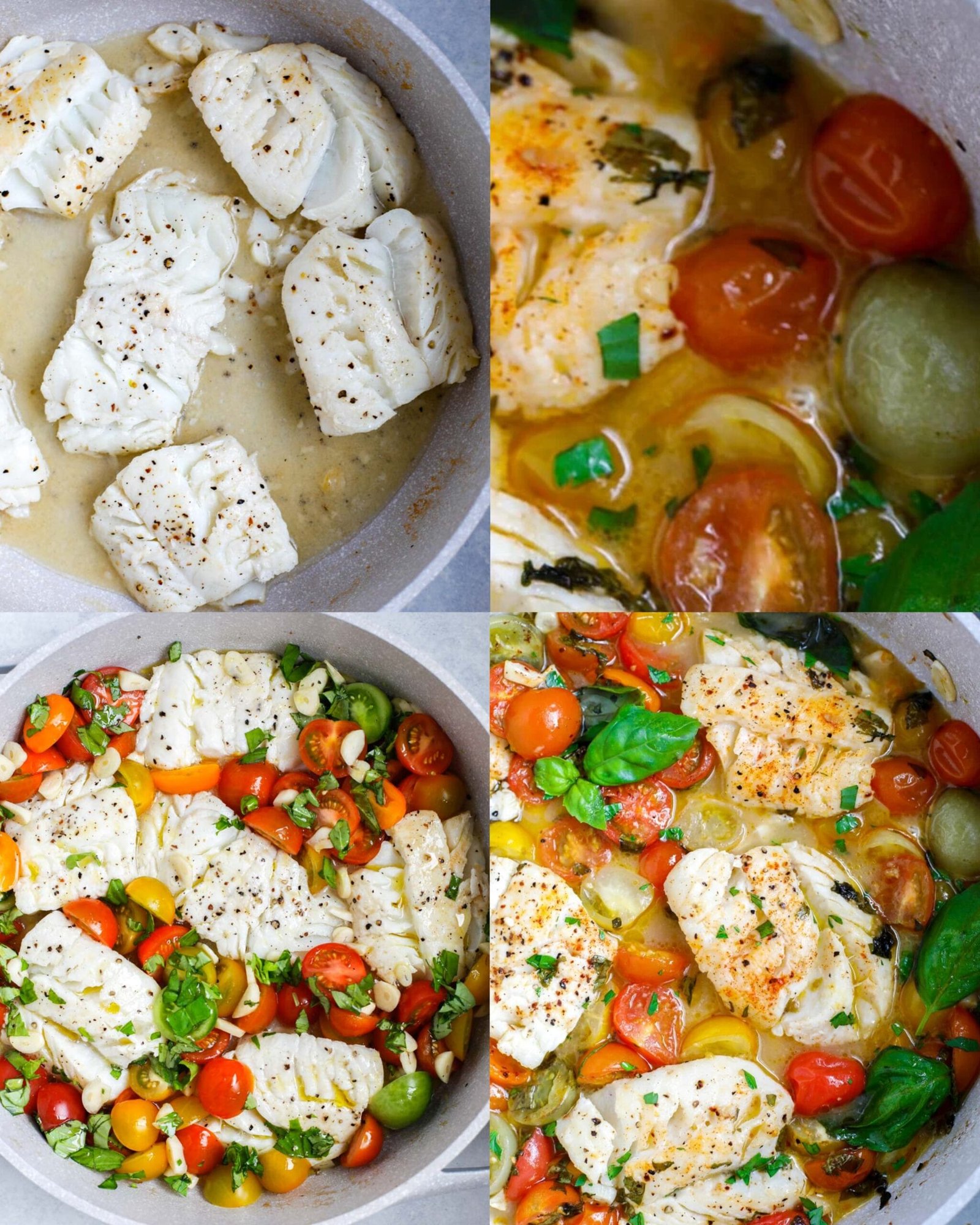 If your skillet is not oven safe, transfer to a baking dish that is oven safe. Add in the “Other” ingredients to the cod and bake for 15 minutes.