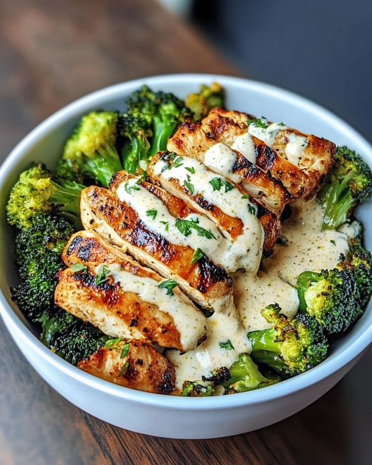 This vibrant bowl features juicy roasted chicken, tender-crisp roasted broccoli, and fluffy grains (like quinoa or brown rice), all topped with a fresh and creamy homemade tzatziki sauce. Balanced, high-protein, and full of Mediterranean flavor — perfect for clean eating or meal prep.